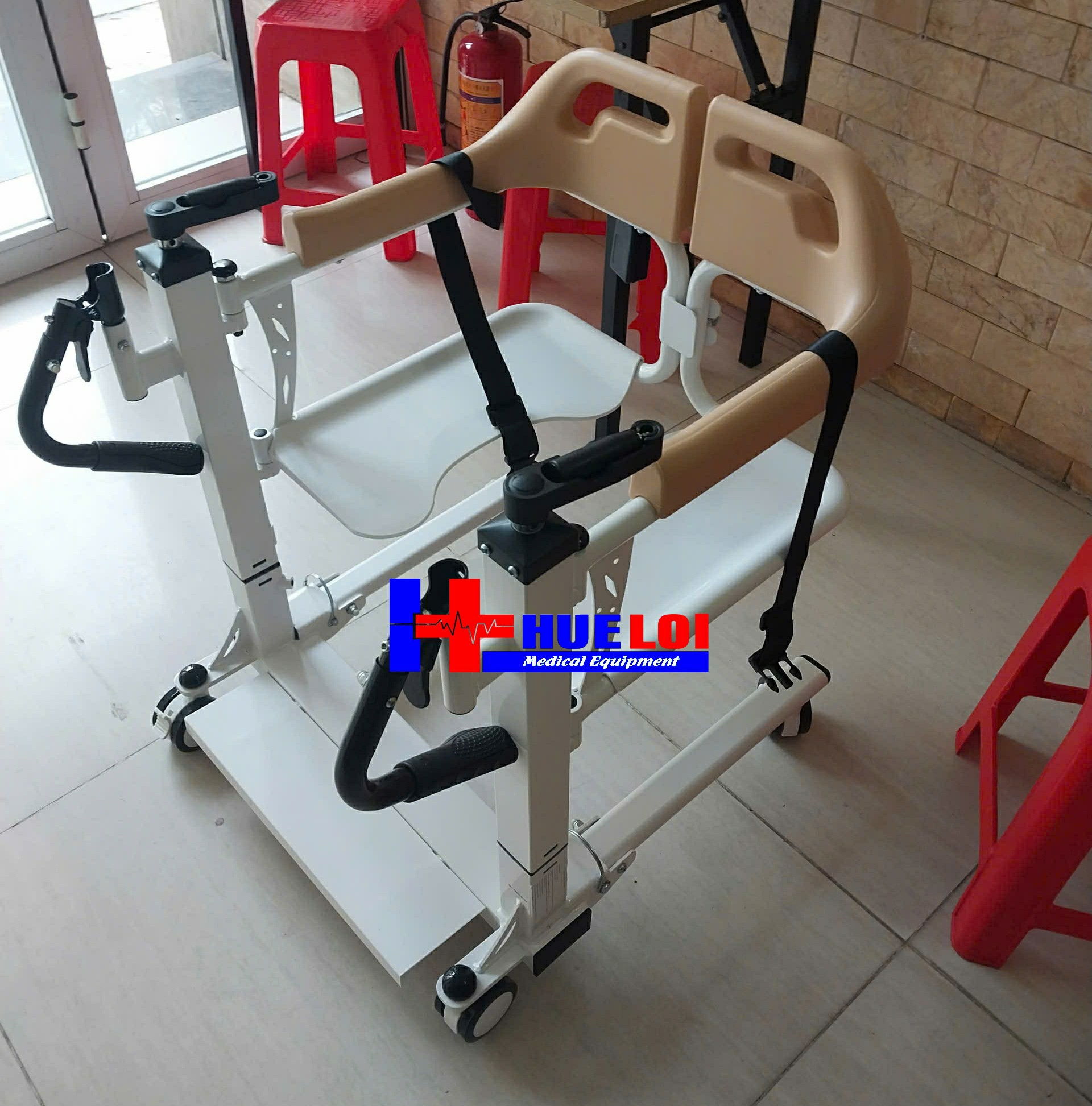 Xe lăn đa năng có thể tách rời thành 2 mảnh, sử dụng tay quay để nâng hạ bệnh nhân, từ đó giúp bệnh nhân dễ dàng ngồi lên mà không cần bê/vác, chất liệu thép cực dày, nhựa ABS chống nước, có bô vệ sinh và đệm lót. Sản phẩm thích hợp cho những bệnh nhân gặp khó khăn trong việc đi lại, giúp người nhà giảm bớt gánh nặng trong việc chăm sóc.